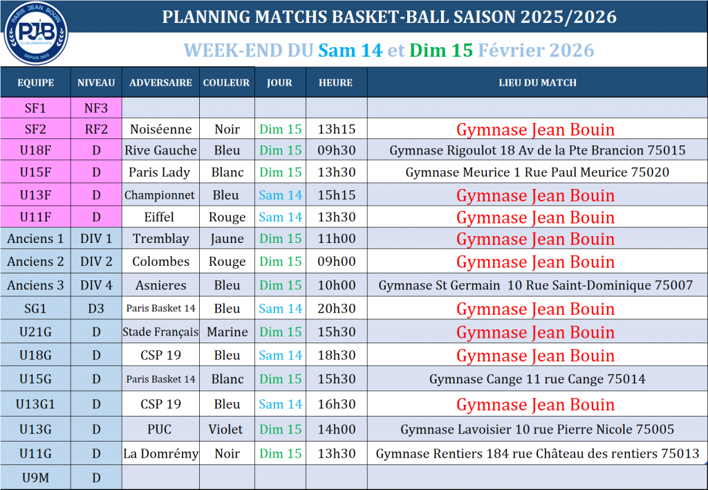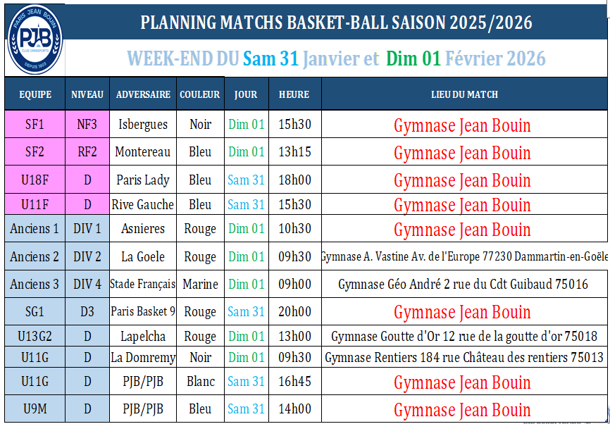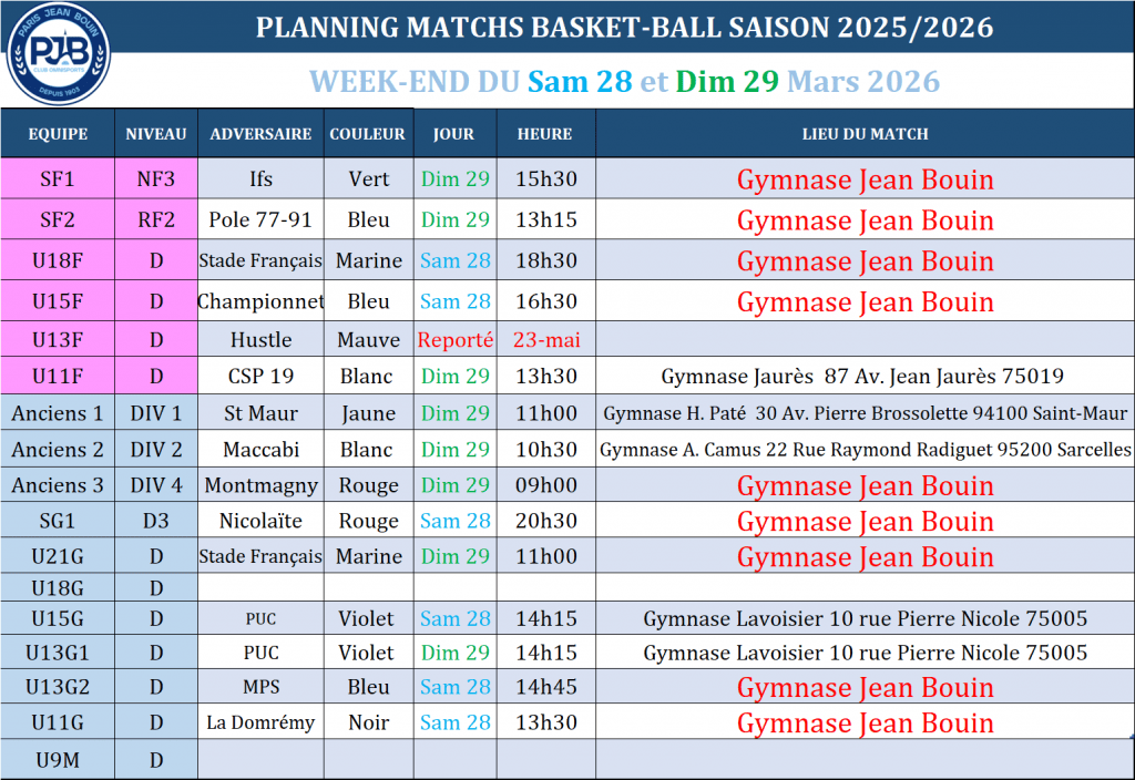 PJB BASKET // Planning des matchs du Week-end