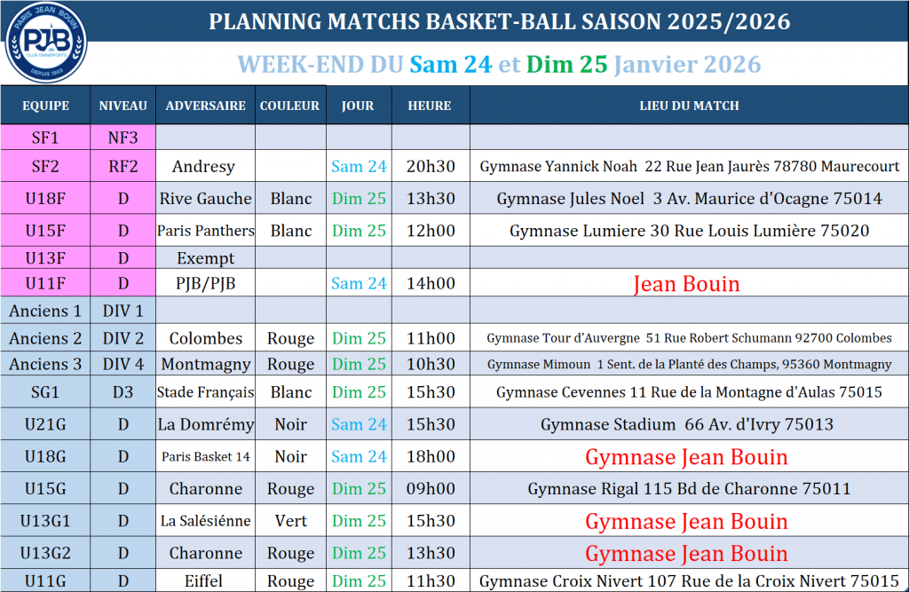PJB BASKET // Planning de la semaine
