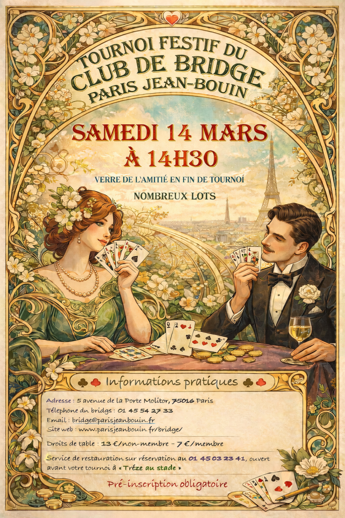 Notre club de bridge, l’un des plus grands clubs parisiens, vous propose des tournois dans une ambiance aussi conviviale que compétitive, dans des locaux agréables et lumineux.