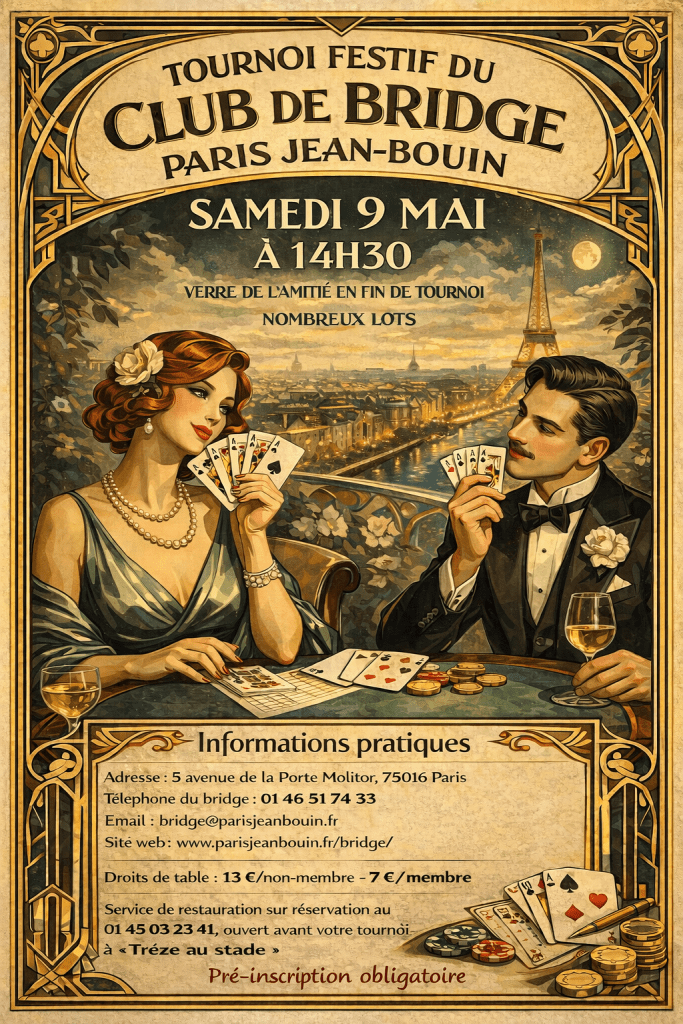Le club de bridge Paris Jean-Bouin vous accueille, ce samedi 9 mai à partir de 14h30, pour son tournoi festif. Ce moment convivial sera l’occasion de vous retrouver, de partager un verre et quelques gourmandises en fin de tournoi, ainsi que de recevoir quelques lots pour les meilleurs et les plus chanceux d’entre vous. Nous…