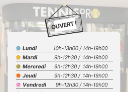 Chers Membres, Nous sommes ravis de vous annoncer que notre proshop TennisPro sera, à compter du dimanche 2 novembre prochain, ouvert 7 jours sur 7. Vous pourrez ainsi bénéficier des conseils et services personnalisés de Stéphane et Gabriel lors de vos visites au club. Retrouvez ci-dessous le détail des nouveaux horaires. N’hésitez pas à venir…