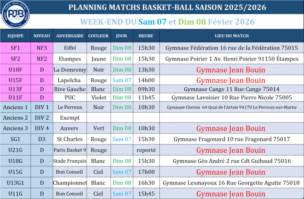 PJB BASKET // Planning des matchs du Week-end