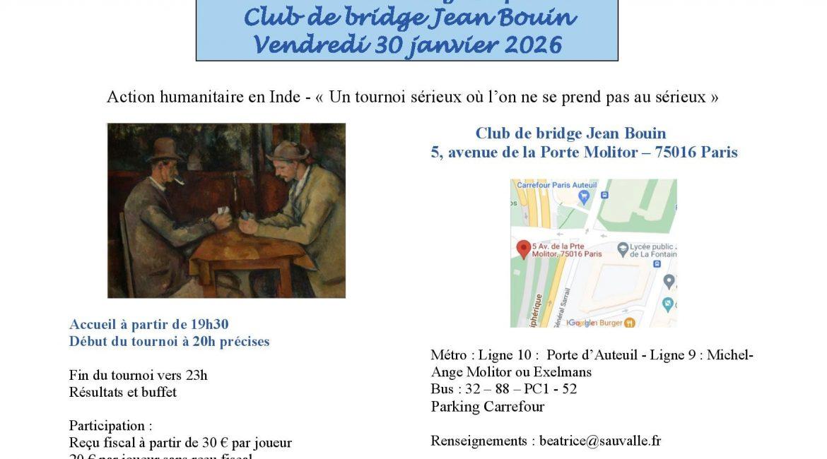PJB BRIDGE // Tournoi caritatif ARPANA – vendredi 30 janvier à 19h30